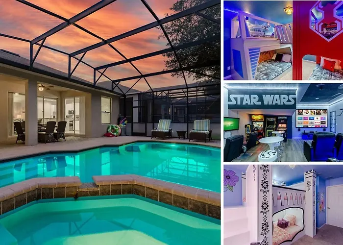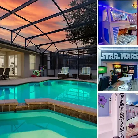 The kitchen amenities at the Orlando accommodation feature an electric kettle, a refrigerator, and glassware, provided in a dining area. American specialties are served at Kenzie's Restaurant, located 2.1 km from Windsor Galaxy 5 Bed/5 Bath Pool Home Near Disney. Church Street railway station is 100 minutes away by car, while Orlando International airport is 45 km from the property.
